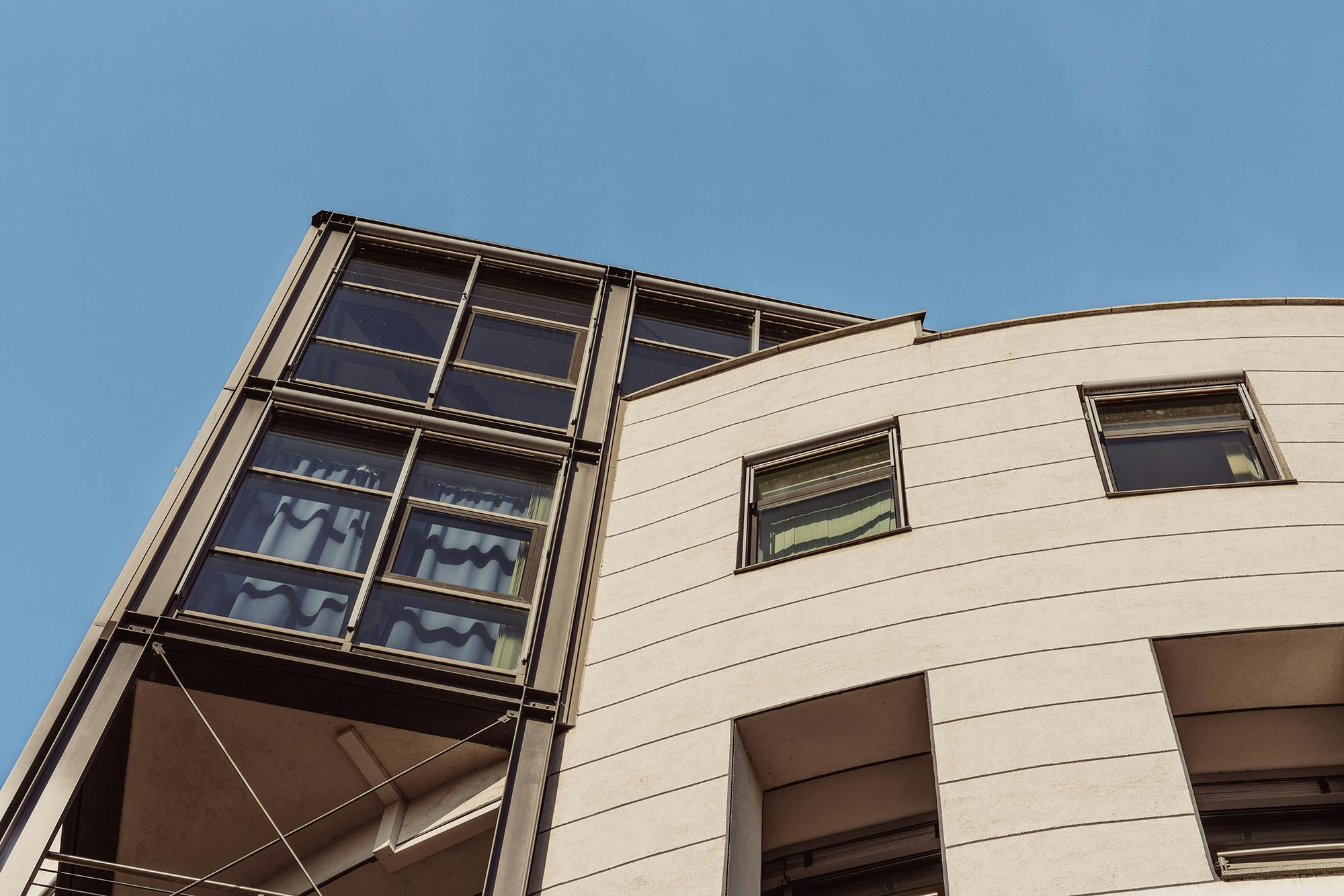 Mit seiner runden Form und den eckigen Glaselementen verbindet das Gebäude moderne Bauweise der 90er Jahre mit kreativen Stilelementen. Die Außenbeleuchtung unterstreicht die einzigartige Architektur perfekt und betont nicht nur die markanten Linien und Konturen des Gebäudes, sondern schafft auch eine harmonische Balance zwischen den verschiedenen architektonischen Elementen. Durch die geschickte Platzierung der Lichtquellen entsteht eine einladende Atmosphäre.